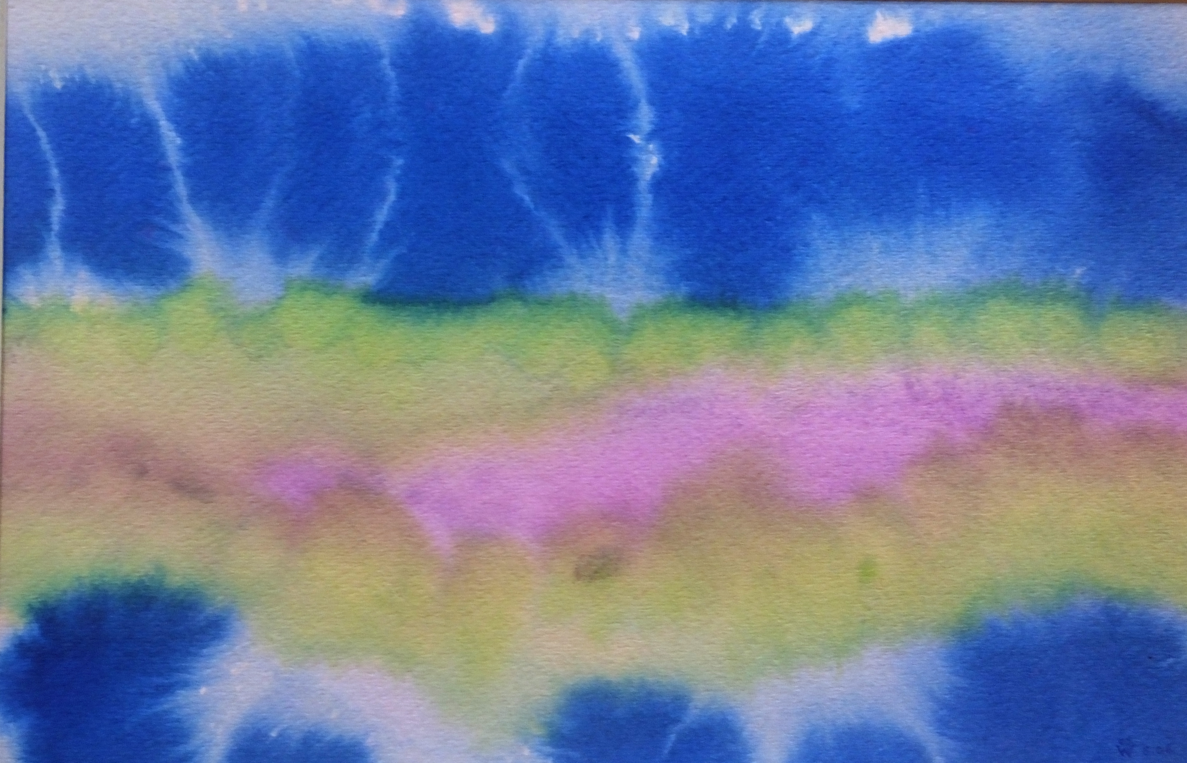 Water is the medium. Water is my brush. Using watercolors on wet paper, I allow the water’s capillary action to “suggest” an image from the natural world and then work with it, using a variety of methods. I have sought to capture scenes from nature with dazzling, bleeding color. The paintings are an exercise in “letting go” and allowing the creative energies to flow, after preparing the mind through meditation.