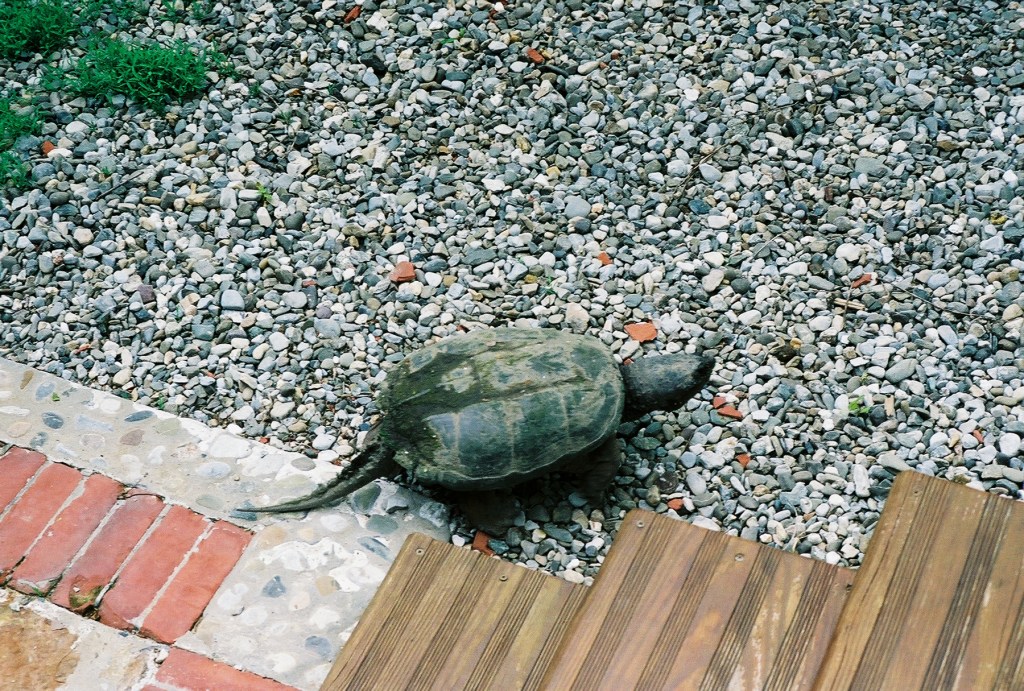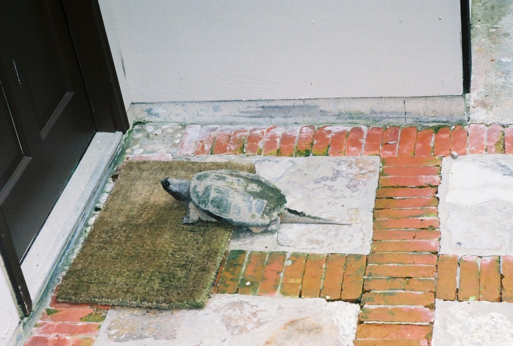 Every year, according to some inner time mechanism, Shelley would come early in the morning to lay her eggs in the swale in the corner of our driveway. A big snapper, she, majestic in her reptilian grandeur. Her shell measured (yes, we measured it) 13 inches, but like all snappers her head juts out of the shell about 4 inches and her spiked, dinosaur-looking tail adds on another 5 inches or so.