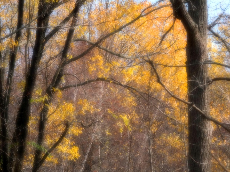 November is the last glimmer of color and in some places the color seems to be predominantly yellow. A carpet of yellow lines the woods now. And now one can see inside the woods, so dark and impenetrable in summer. Some forests have carpets of oak leaves– dark brown tan in color. Or there are forest paths with variegated colors– vibrant crimsons against yellows and faded greens and tawny tans. The unmown lawns are now taken over by the spiders and, at moments, one can see a world of webs covering fields that only appear in a certain slant of sunlight. It is the silent take over of the spiders before the snows come.