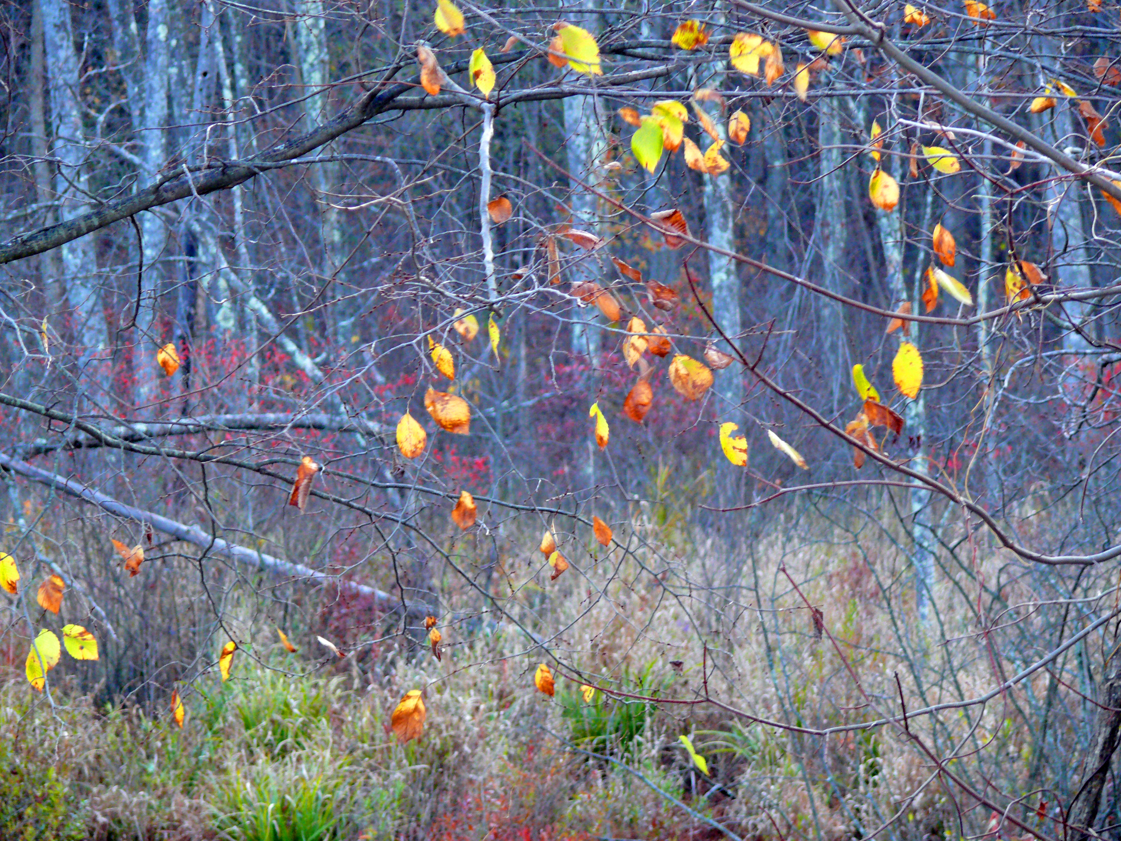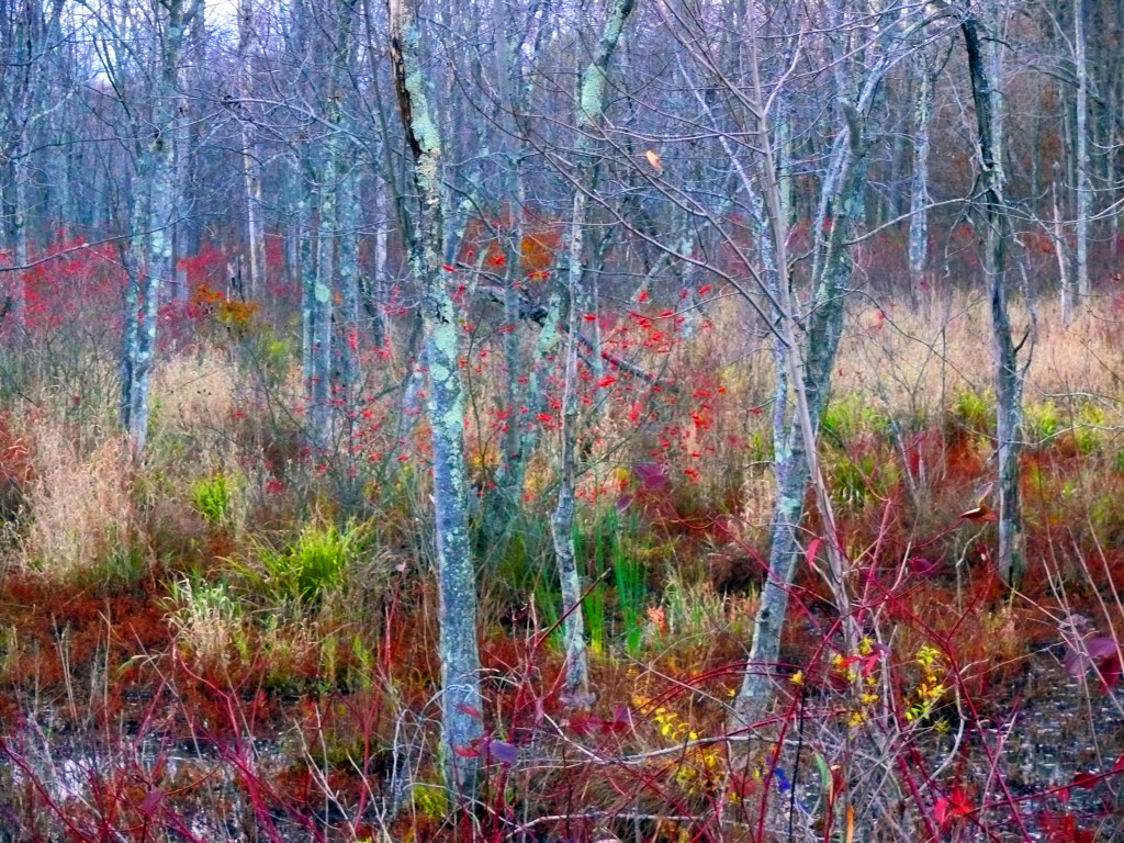 November is the last glimmer of color and in some places the color seems to be predominantly yellow. A carpet of yellow lines the woods now. And now one can see inside the woods, so dark and impenetrable in summer. Some forests have carpets of oak leaves– dark brown tan in color. Or there are forest paths with variegated colors– vibrant crimsons against yellows and faded greens and tawny tans. The unmown lawns are now taken over by the spiders and, at moments, one can see a world of webs covering fields that only appear in a certain slant of sunlight. It is the silent take over of the spiders before the snows come.