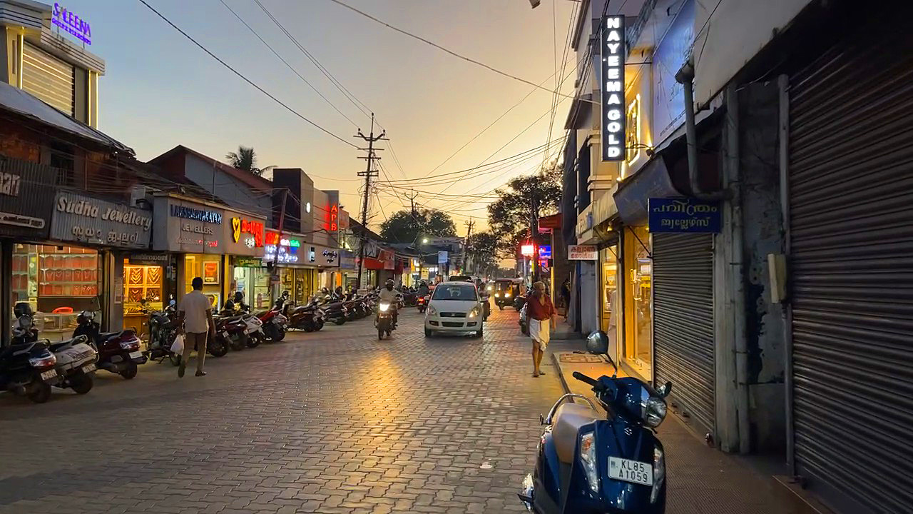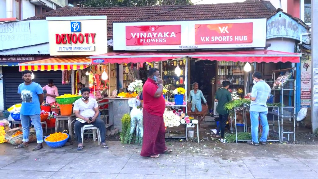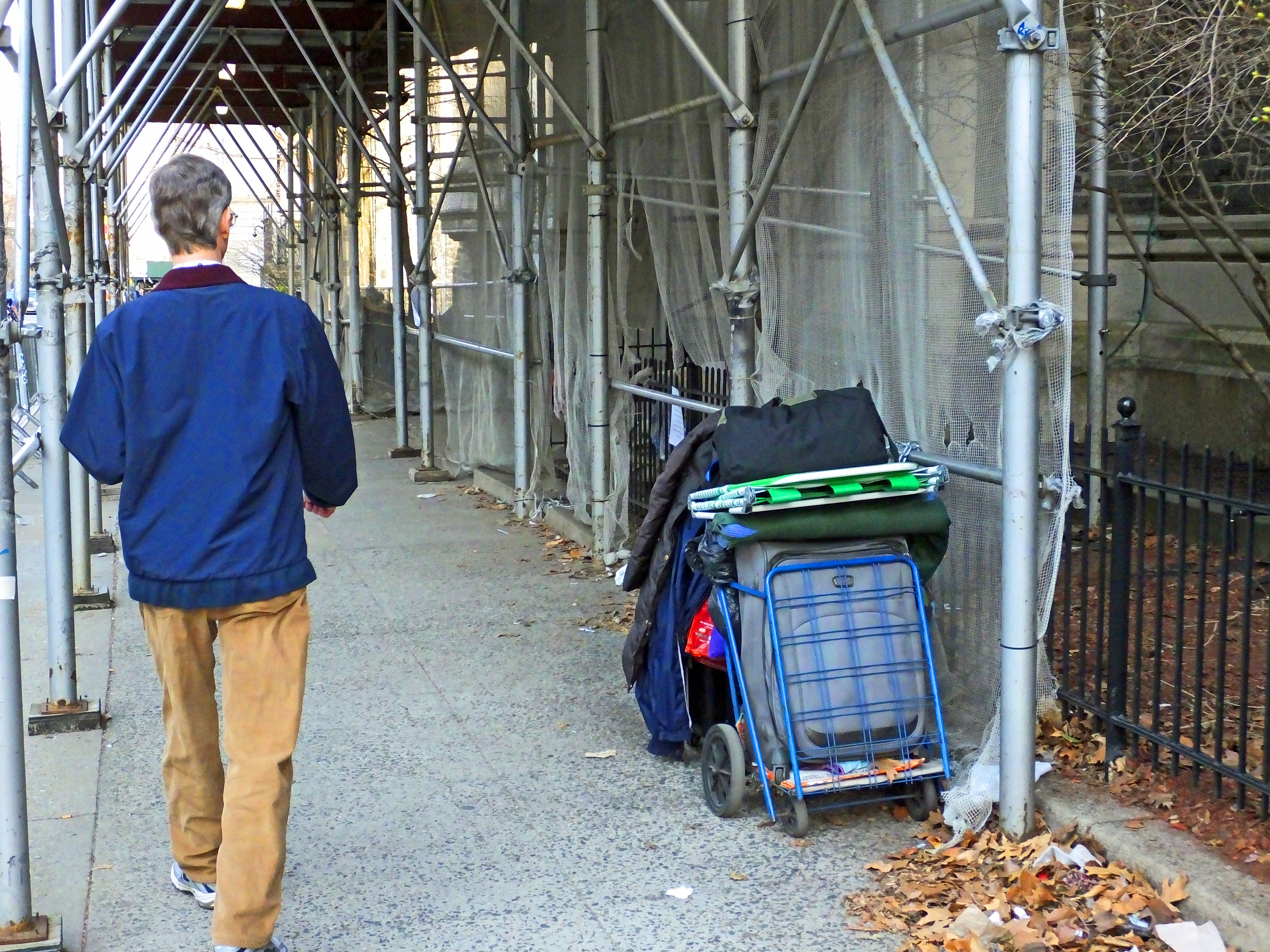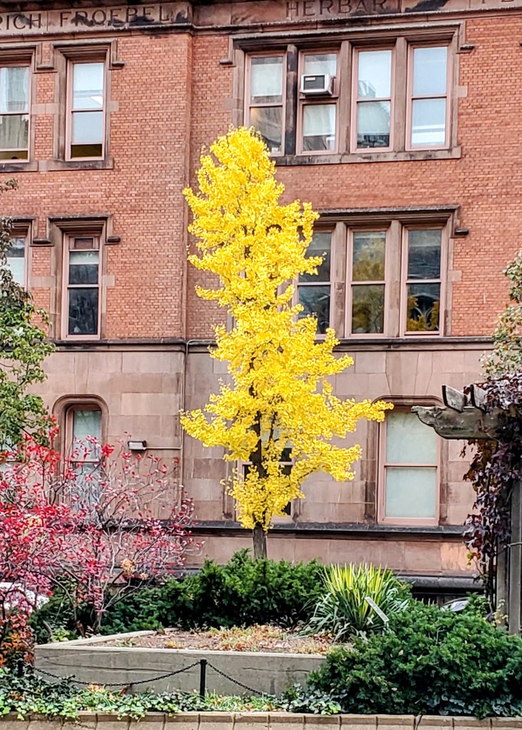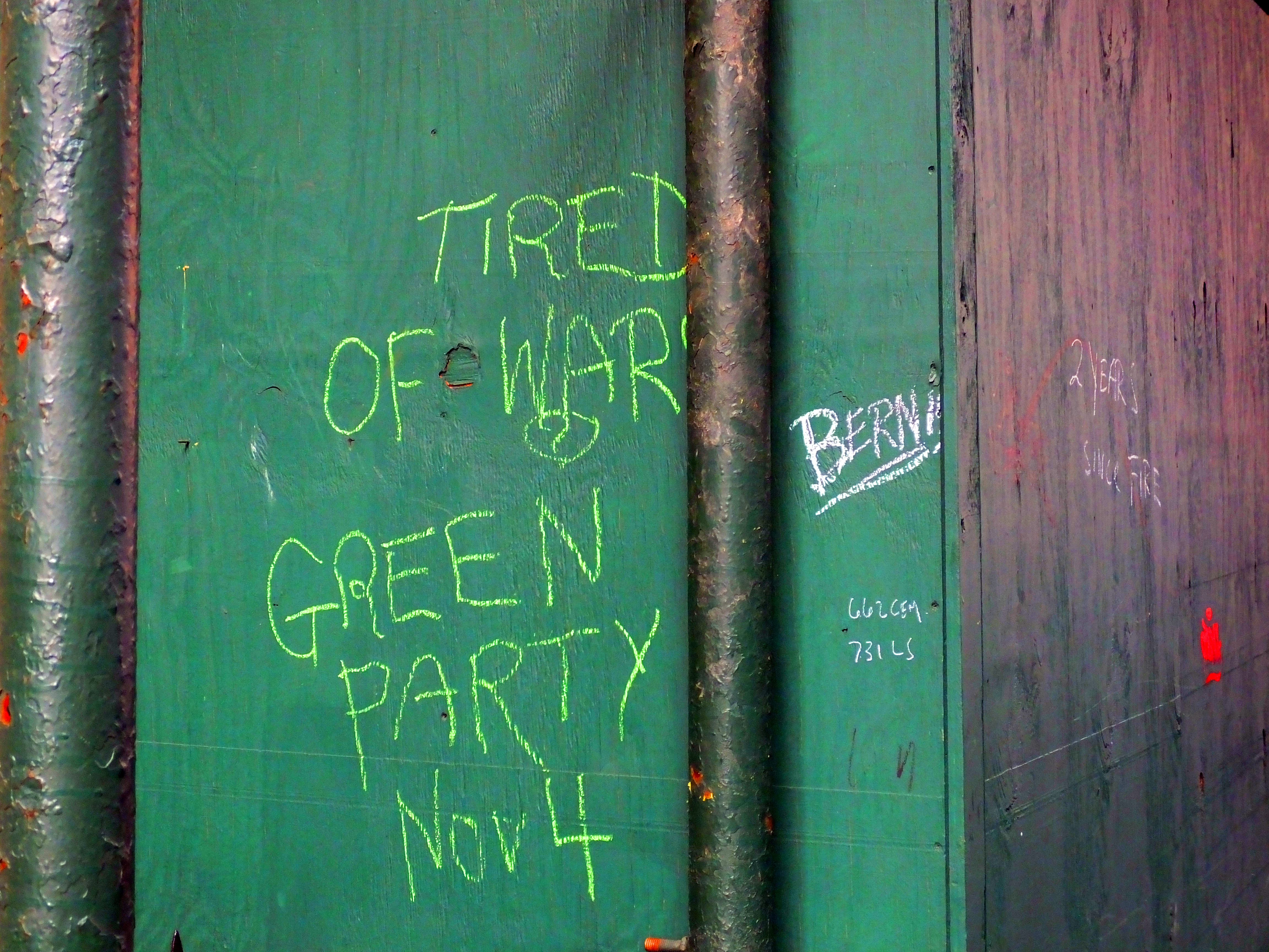 The reflections of the trees in the windows is a view of another world when set against the background of colorful signage, notices, and advertisements.
